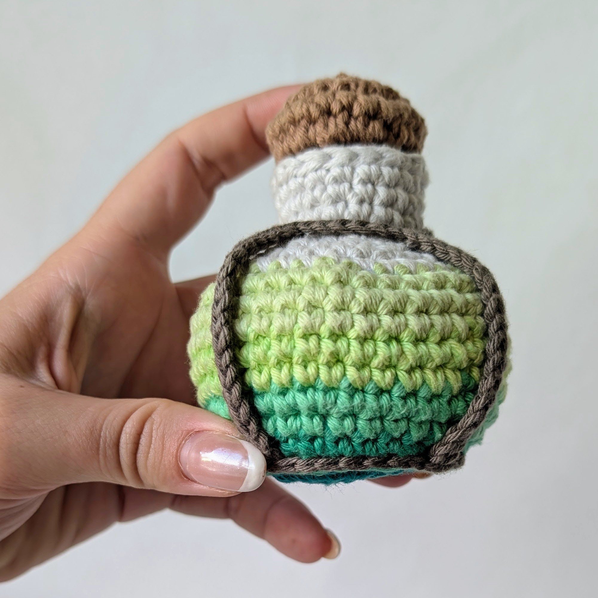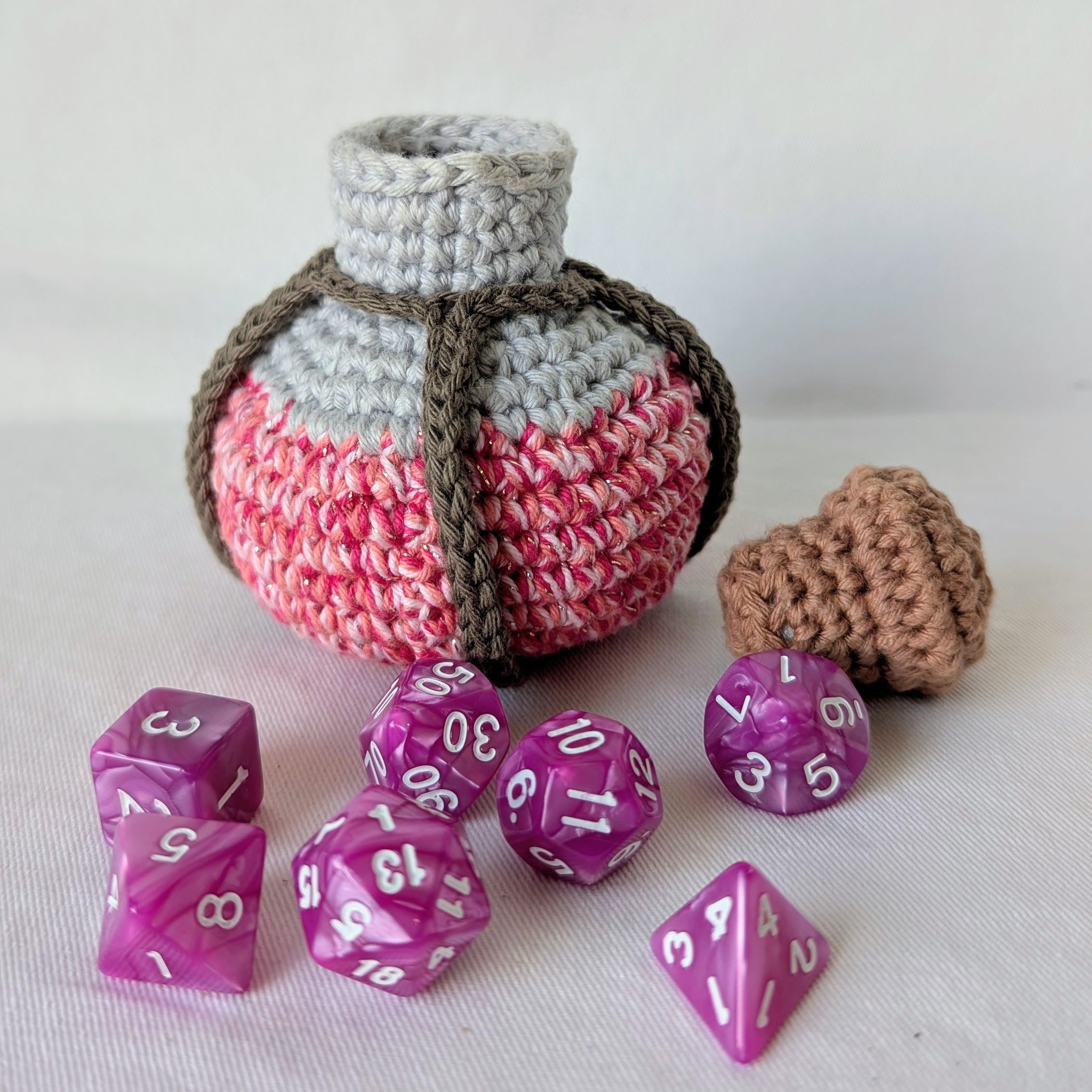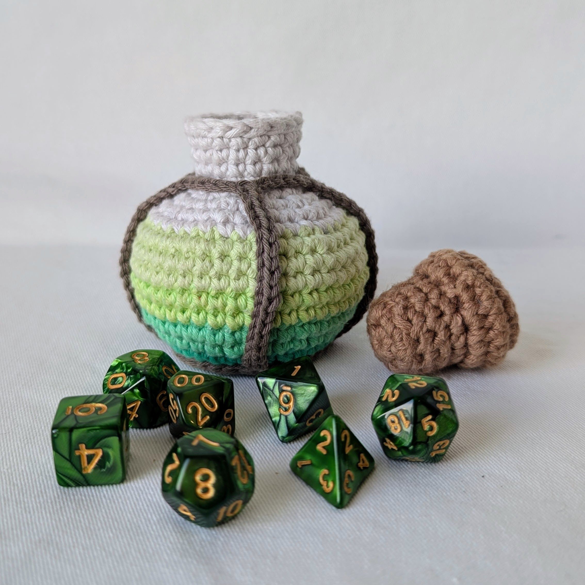 Chaque potion a été réalisée à la main, au crochet. Les dés sont inclus (couleur assortie à la fiole), et le bouchon se ferme bien.